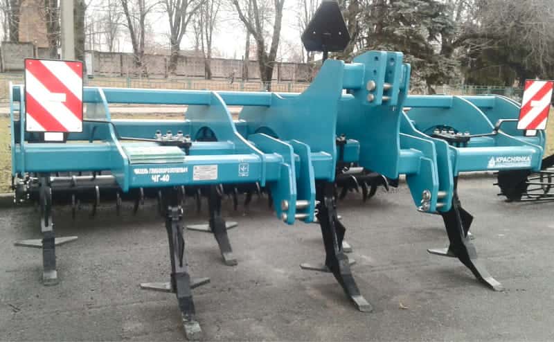 Чизель глубокорыхлитель модели ЧГ — 4 В разработан к тракторам мощности (до 400 л.с.) ЧГ — 3 В разработан к тракторам мощности (150-180к.с.) Рабочая глубина обработки составляет 25-40 см при ширине захвата 4 метра. Новая сварная конструкция рамы, не которой установлены в 2 ряда чизель глубокорыхлителями позволяют выдержать любые усилия, меры срезанные болты обеспечивают защиту машины от столкновения с препятствиями при глубоком рыхлении почвы. Большой зазор между грунтом и рамой и оригинальная конструкция рабочего органа глубокорыхлителя позволяют сделать более эффективным глубокое рыхление почвы с образованием «волны» и предотвращает забивание машины почвой и растительностью. Расположение на раме в 2 ряда рабочих органов — глубокорыхлителя обеспечивает равномерную и стабильную работу агрегата на заданную глубину обработки по всей ширине захоплення.