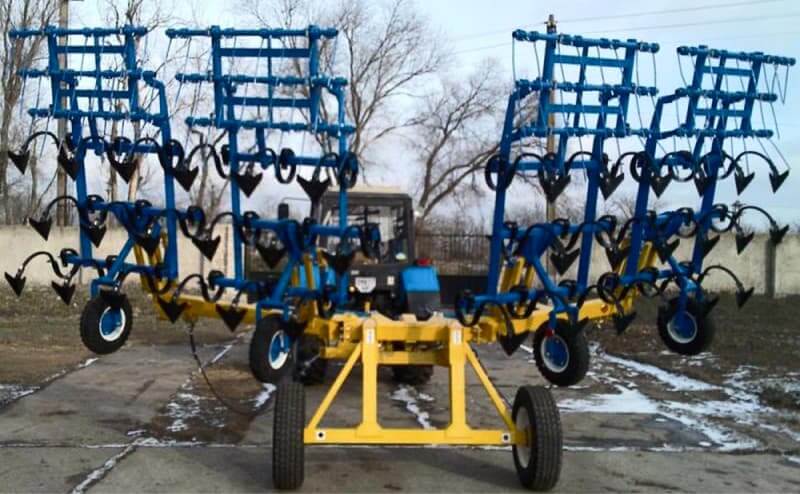 Имея разный захват, у наших культиваторов есть общее: секция шириной захвата 1,5 м. с тремя рядами S-образных стоек с подпружинниками,перекрытие лап в 80 мм.трехрядные боронки с пружинным зубом,каждая секция регулируется своим колесом. Секция с пантографным механизмом имеет возможность идеально копировать рельеф почвы (добиваясь требуемых 5-7 см на всей поверхности поля), рабочая скорость культиватора от 8 км на первой культивации до 16 км/ч — на парах. Пружинные S-образные стойки с подпружиником и лапой 260 мм работают по принципу перфоратора (вырезая и вырывая с корнем все без пропусков, что даёт экономию топлива от 30 до 50% по сравнению работы агрегатов с другими культиваторами).