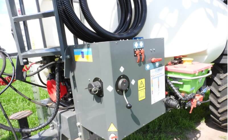 Для управления ключевыми функциями опрыскивателя (приготовлением раствора в миксере, подачей рабочей жидкости, промывкой емкости, заправкой основной емкости, промывкой системы) предусмотрена управляющая панель, расположенная в его передней части. Использование панели сводит к минимуму ошибки и делает работу оператора более комфортной.