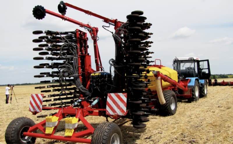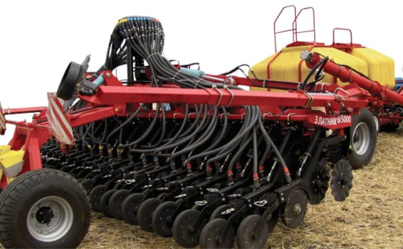 Посевной комплекс ЗЛАТНИК — машина для подготовки почвы и посева, применяемая во всех технологиях: может сеять как по минимальной, так и по нулевой технологиям, благодаря высевающему блоку c усиленными двухдисковыми сошниками (оснащение волнистыми дисками, установленными перед каждым сошником, позволяет работать по большему количеству пожнивных остатков).